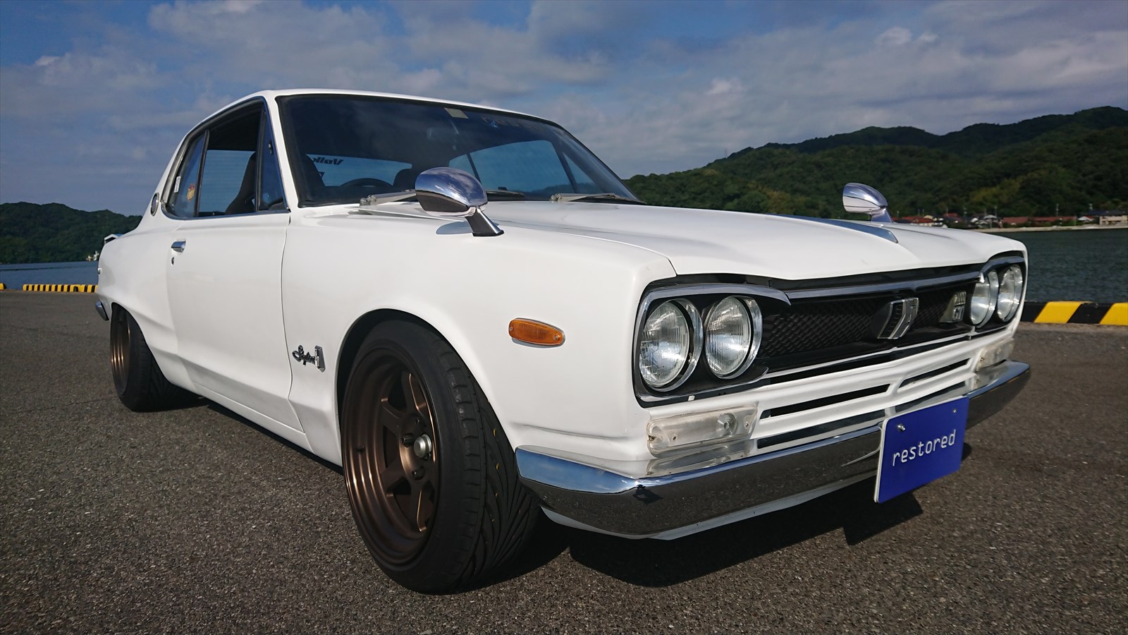 GC10スカイライン用フィアレスブリスターフェンダーキットの完成です!フロント30㎜、リア35㎜ワイド化されたフェンダーに収まるRAYSTE37V・F8JR8.5Jの精悍なスタイルを